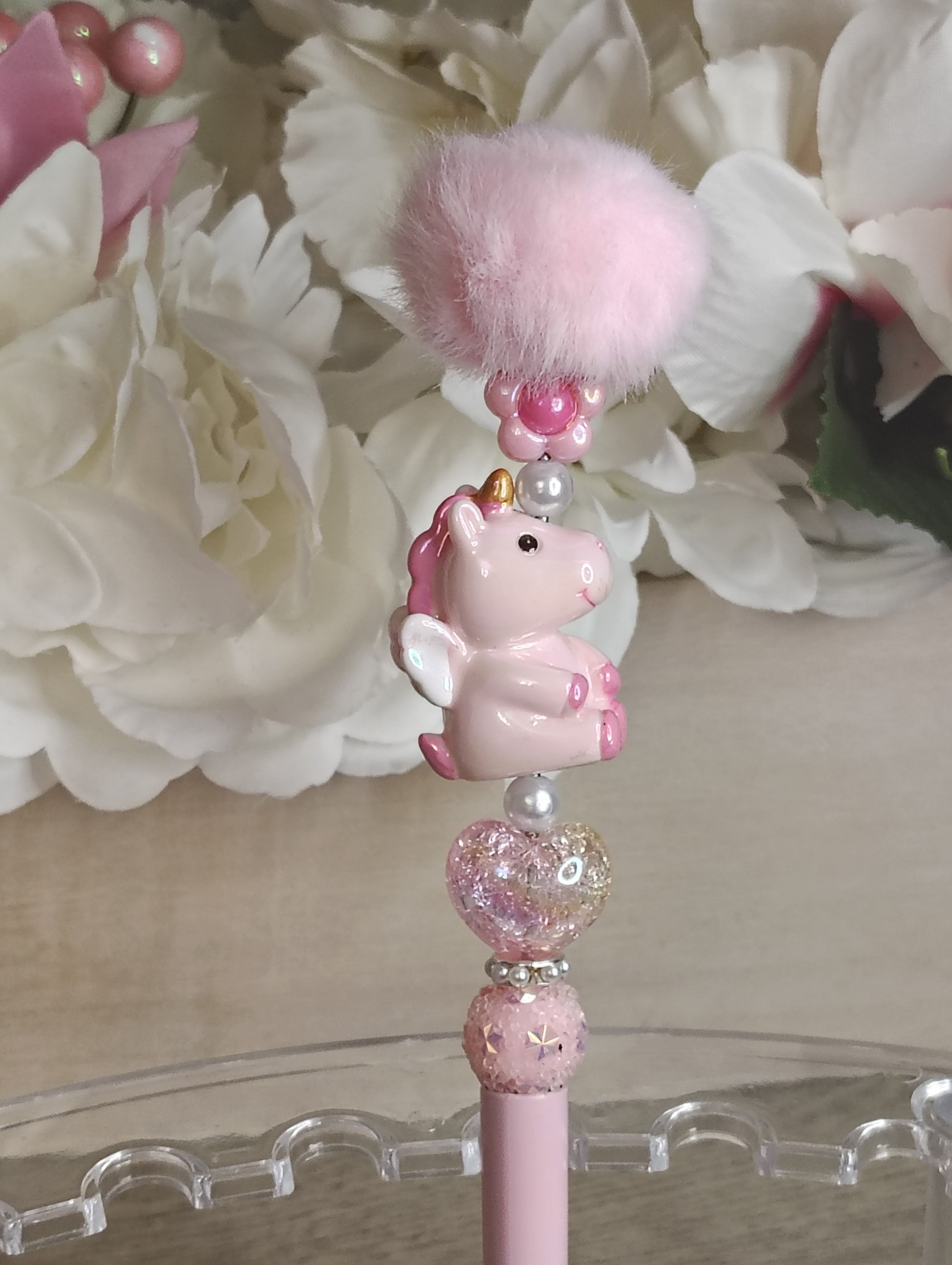 This handcrafted unicorn beaded pen features a darling pink unicorn charm, a fluffy blush pom-pom topper, and sparkling pink accent beads that shimmer with every move. Finished with a soft pink pen barrel, it’s equal parts magical, cozy, and glam.
