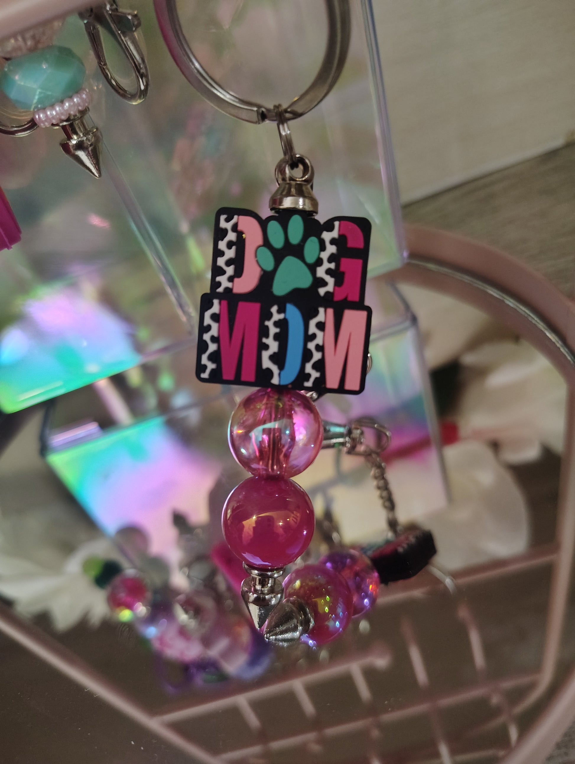 Show off your fur-mama pride with this adorable Dog Mom Beaded Keychain. Featuring a bold “DOG MOM” charm with a paw print detail and glossy pink iridescent beads, this keychain is a must-have for dog lovers everywhere.